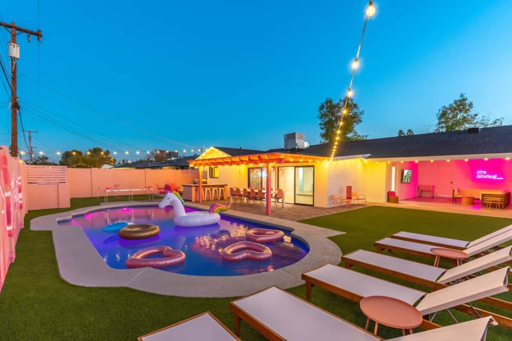 The Pink Icon Scottsdale Airbnb is the new Femme House AZ property! 5 min to Old Town & views of Camelback! This pink Airbnb features a pink backyard with a large heated pool, 6 loungers, our ICONIC pink Scottsdale mural, pink BBQ and outdoor dining for 14! Our heart shaped putting green + pink pong table are calling your name! Enjoy a 7 person beauty bar while you get ready and pink cactus and pink palm throughout! Our pink bachelorette house is for the girls that are HOTTER THAN THE DESERT!